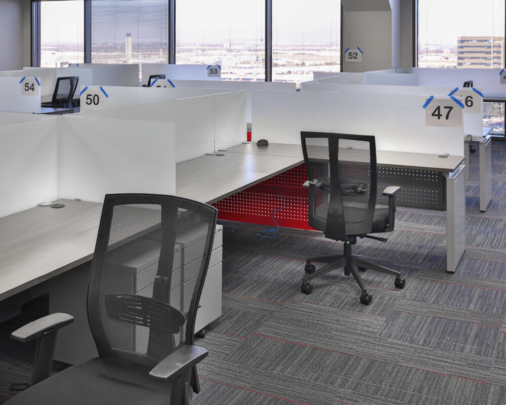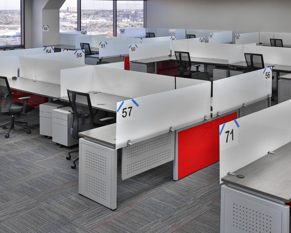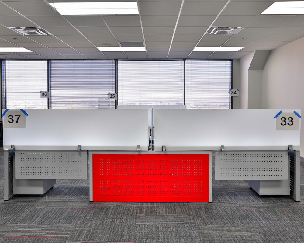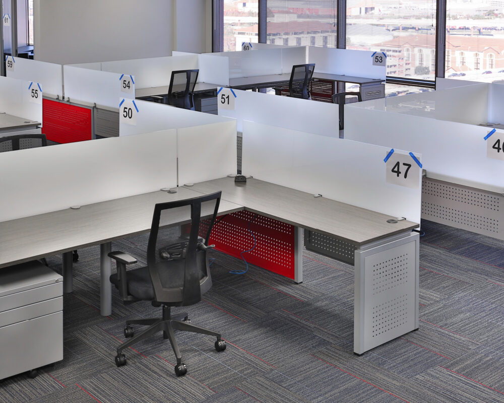 This client selected Blade L-Shape Workstations for their open plan areas, equipped with dry-erase frosted-glass dividing screens and steel storage. Also, to incorporate the company’s branding, custom-painted steel end-panels were specified.