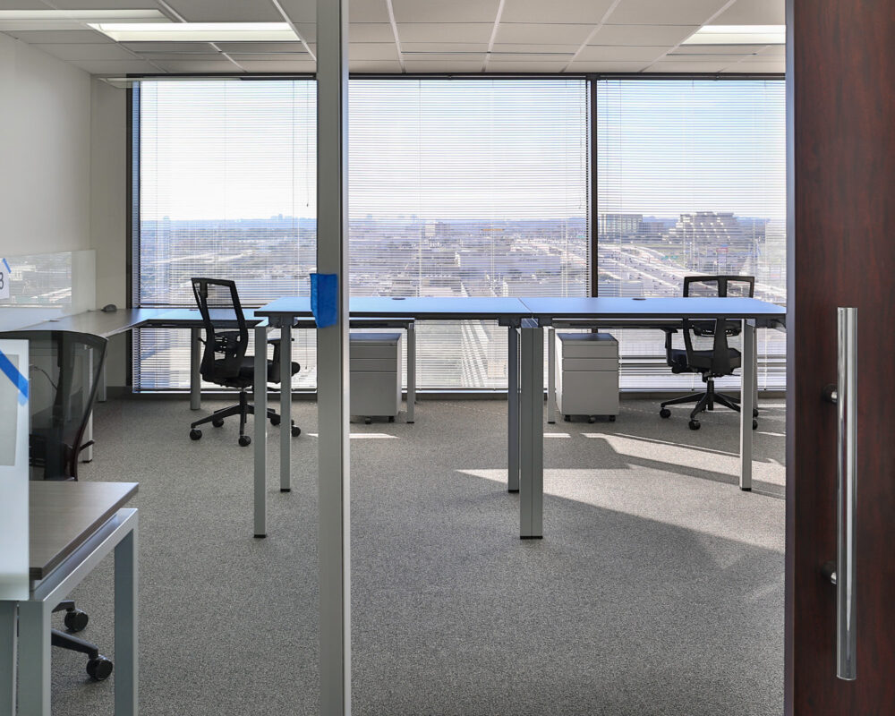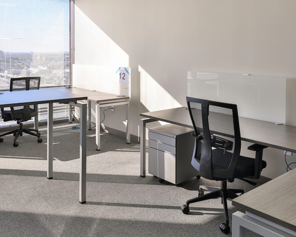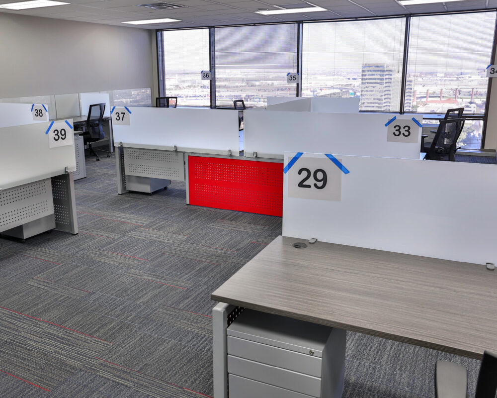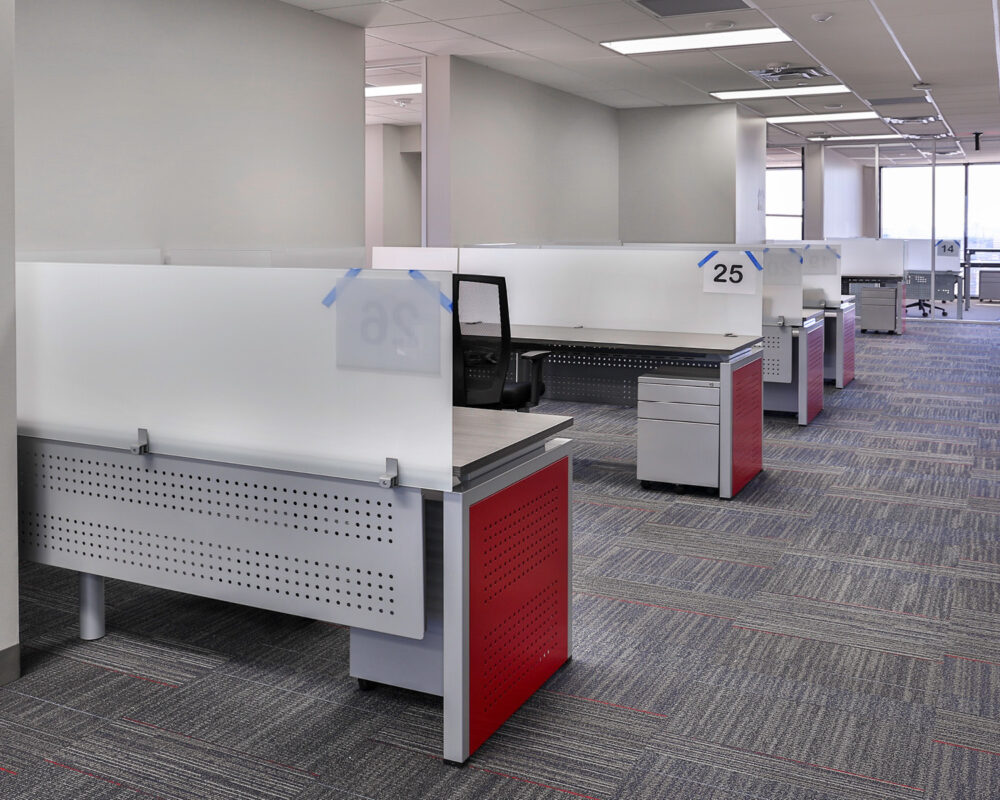 This client selected Blade L-Shape Workstations for their open plan areas, equipped with dry-erase frosted-glass dividing screens and steel storage. Also, to incorporate the company’s branding, custom-painted steel end-panels were specified.
