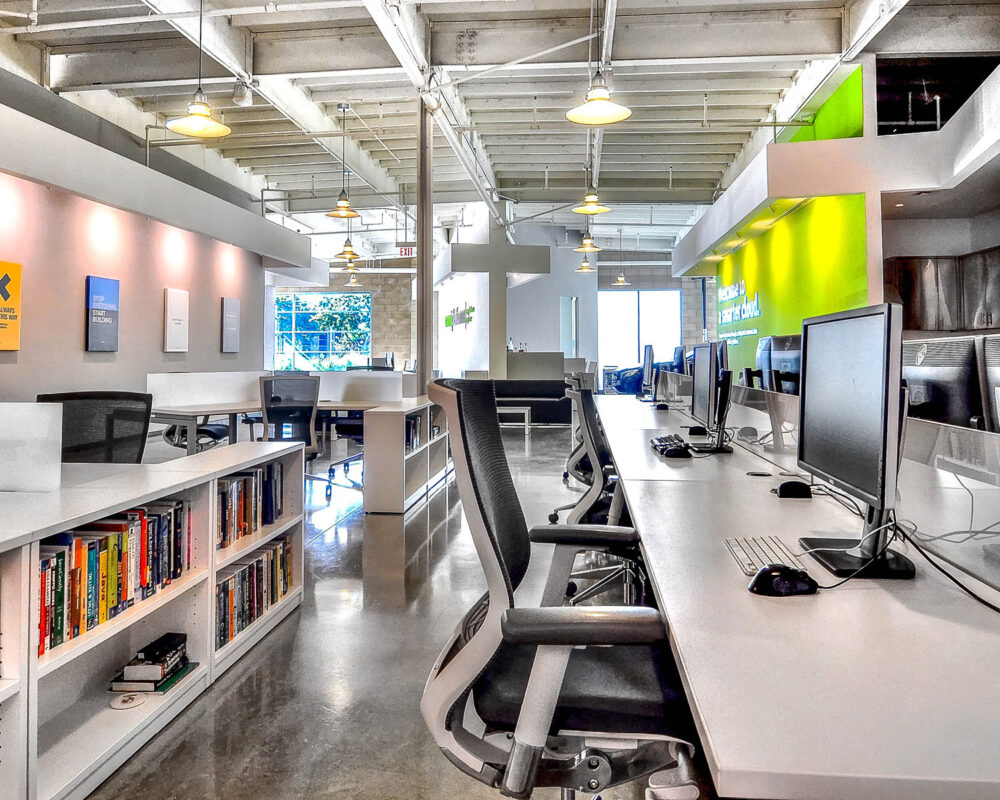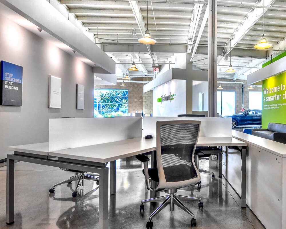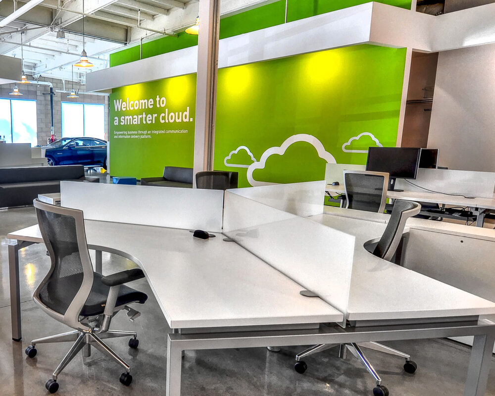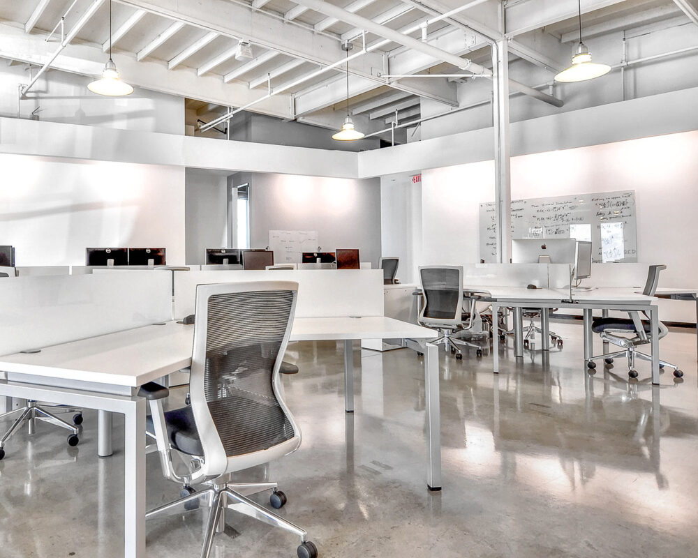 From the 11” high, dry-erase frosted glass dividers to the white surfaces & silver steel, this sleek, modern open plan office is optimized for communication & teamwork.