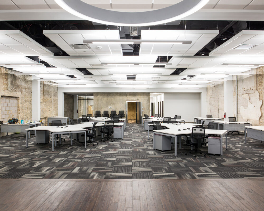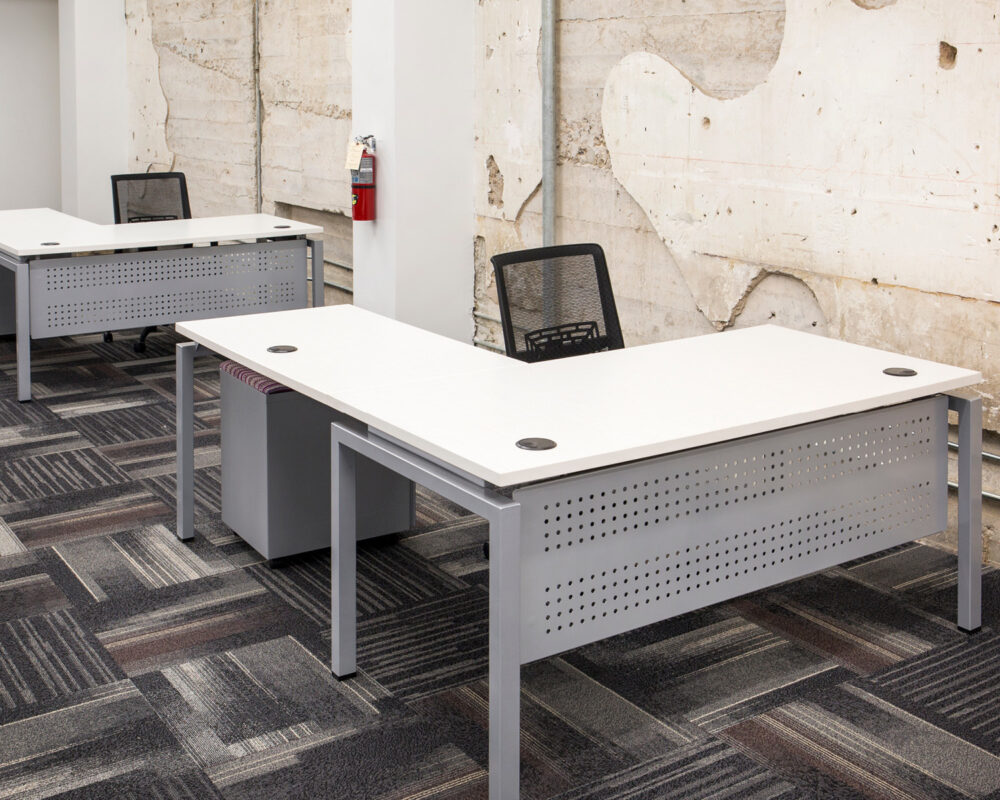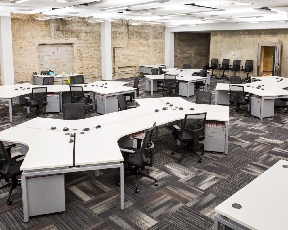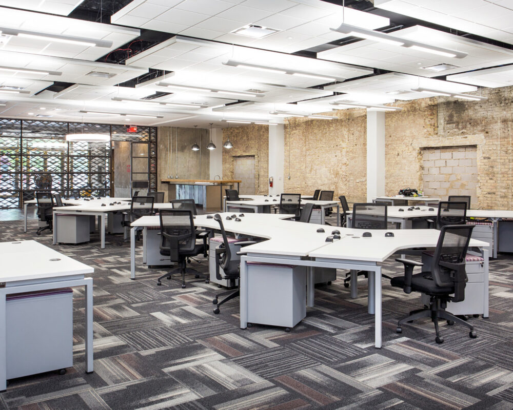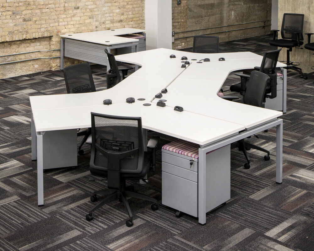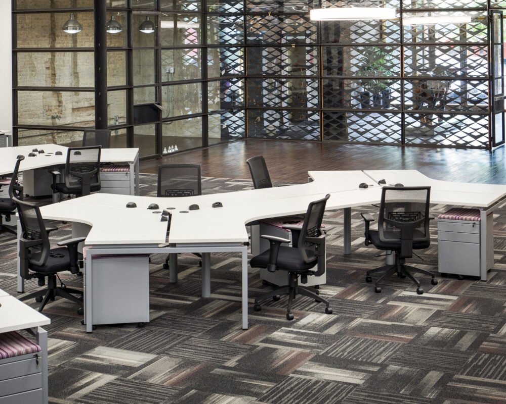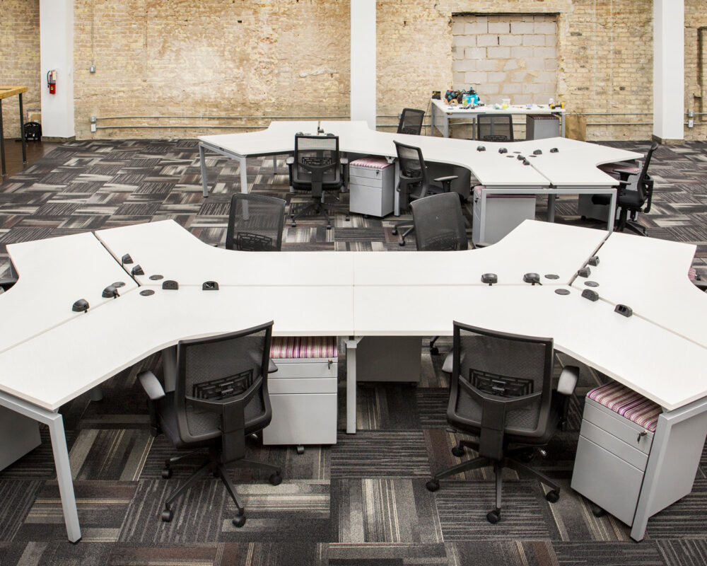This client chose Blade because of its innovative, cost-effective, and functional design. The 120 Degree Workstations maintain a culture of collaboration and transparency within their open-plan office layout while providing fully-integrated power and data, non-linear lines of sight, and pedestal storage.