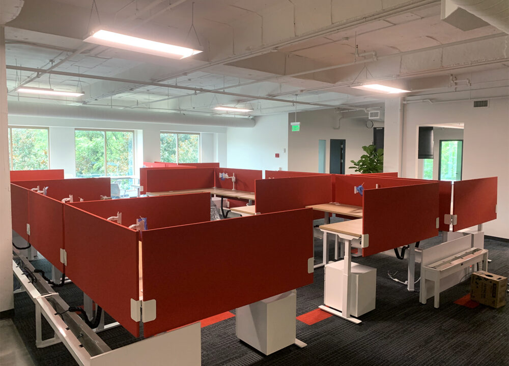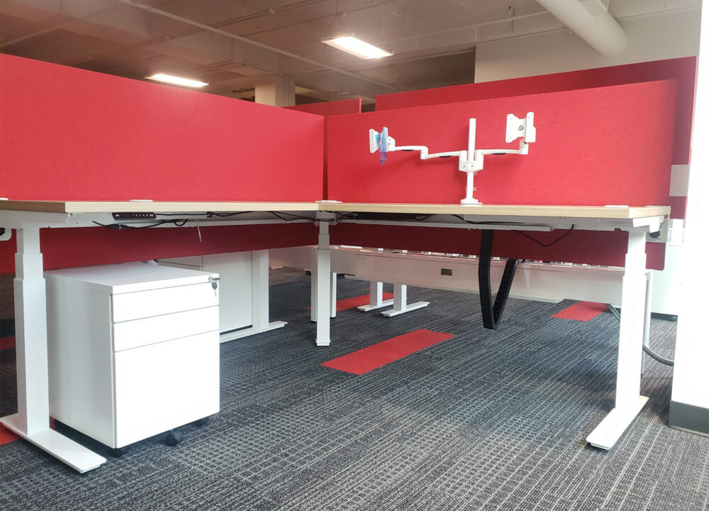 The workstations are outfitted with Boost L-Shape height-adjustable desks with Sonic Maple laminate and White steel finish. Each desk also has desk-mounted Tackable Fabric Dividers in a stunning Raspberry color (FX Program) and Dual Monitor Arms to maximize efficiency.